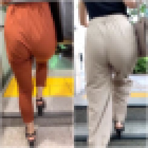 今宵特集するのは、 黒のトップスと白パンツ姿のお姉さん2名。 ありふれた組み合わせだが、 良い質感かそうで無いかでセレブ感の差が出る。 【ガードしないから透けてしまったパンティーライン】 1人目は、美容室へ向かう金髪お姉…
