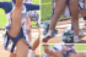 『本選では、青と白のウェアの※※**※※が、試合前にステージに勢揃いしていたので、超ミニからこぼれる太腿の奥をなめるように撮っていました。演技になると、ターンやキックやスタンツなど一通りのアクションはしてくれました。特に楽曲の演技では、腿の裏が見えるくらいのキックや腰振りが炸裂するシーンもあり、大いに目の保養をさせてもらいました。手前の青の娘はしばらく踊っていると食みパンになっていました。チアの出番はとても多くたっぷり愉しめました。
